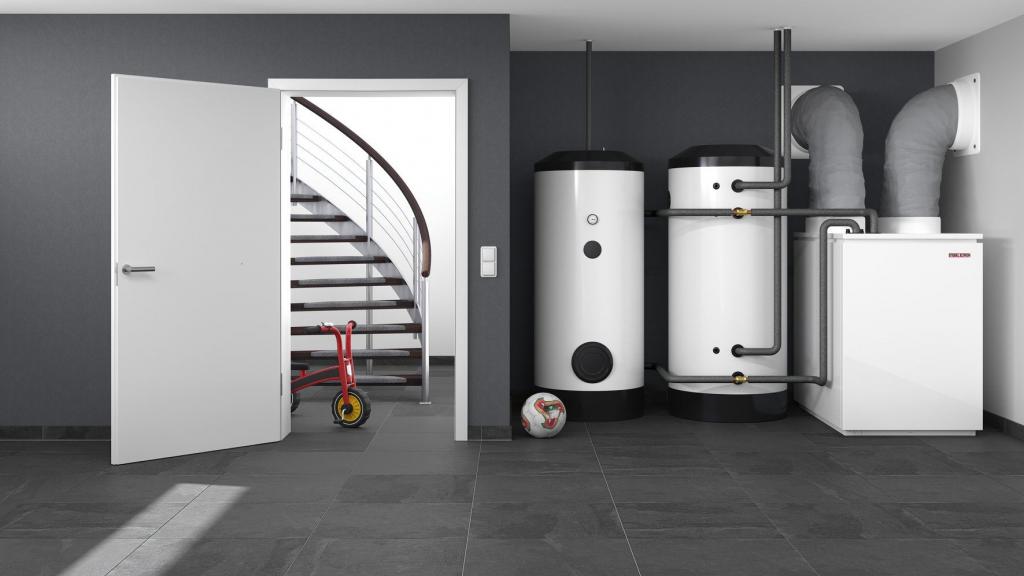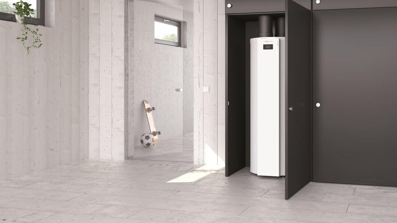 Wie die Wärmepumpe mit Luft Wärmeenergie erzeugt, lässt sich vereinfacht mit dem Beispiel eines Kühlschranks beschreiben. Während der Kühlschrank die warme Luft nach außen leitet, bringt die Luft-Wasser-Wärmepumpe die Wärme aus der Umgebungsluft in den Raum. Konkret saugt ein Ventilator aktiv die Umgebungsluft an und überträgt sie auf einen in der Wärmepumpe eingebauten Wärmetauscher (Verdampfer). Darin zirkuliert ein Kältemittel, das bereits bei niedriger Temperatur seinen Aggregatzustand ändert und verdampft. Um diesen Kältemitteldampf auf ein für Heizung und Warm-wasserbereitung nutzbares Niveau anzuheben, wird er mithilfe eines Verdichters komprimiert.