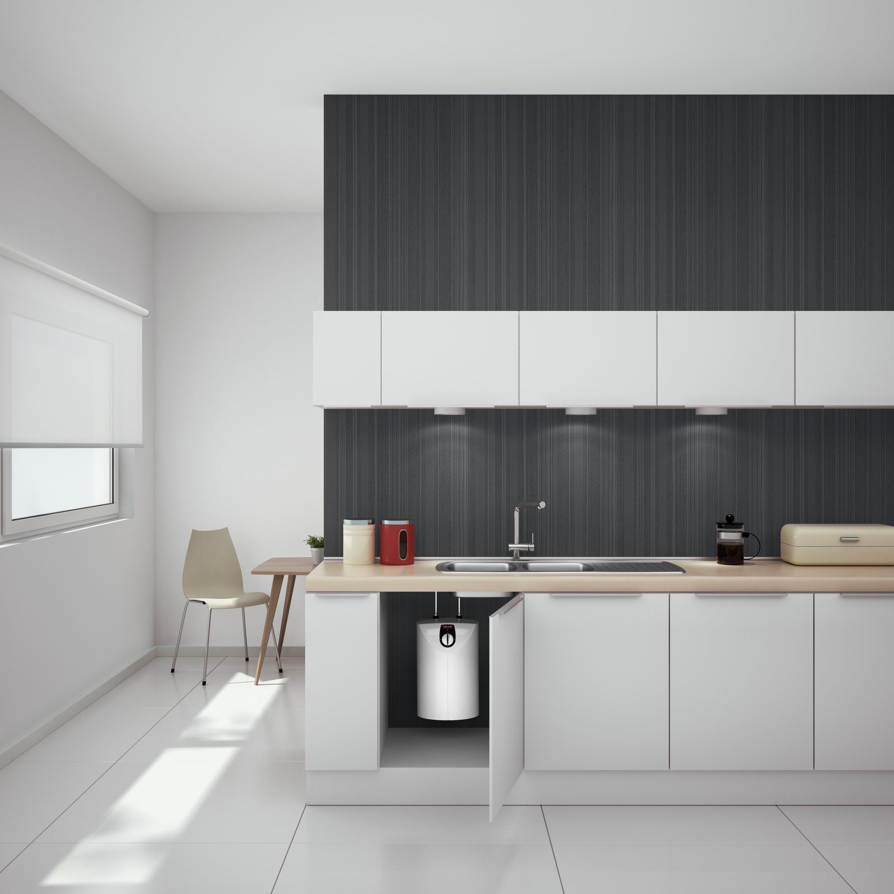 Der Tischspeicher lässt sich perfekt in jede Küchenzeile integrieren oder als Beistellgerät nutzen. Mit nur geringer Breite und verstellbarer Höhe passt dieser Warmwasserspeicher zum Beispiel gut in Dachgeschosswohnungen. Mit 80 Litern Inhalt versorgt er Ihren Haushalt bedarfsgerecht und wirtschaftlich mit warmem Wasser – vom Geschirrspülen bis zum entspannten Bad. Dabei kann er dauerhaft auf Temperatur gehalten oder zum günstigen Nachtstromtarif erwärmt werden.